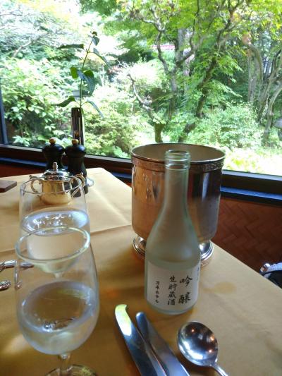 8月26日に予約して、8月29日12:30からランチ「碓氷」7500円を、窓側の席で庭を眺めながら頂きました。青紅葉などが美しかった。お酒はコスパで冷酒「吟醸生貯蔵酒万平ホテル」300ml 1580円をチョイス。前菜は田舎風豚肉のパテとプロシュートの盛り合わせ 葉野菜のサラダ添え。パテ:肉や魚などの具材を細かく刻み、ペースト状あるいはムース状に練り上げたフランス料理。プロシュート:加熱しない生ハム。人参ポタージュスープ 。メインは真鯛のポワレ ヴァンブランソース 長野県産きのこのソテーを添えて & 牛フィレ肉のグリル ソースヴァンルージュ 季節の温野菜添え。ポワレ:液体を加えずにオーブンで肉を蒸し焼きにする調理法。ヴァンブランソース:白ワインのソース ソースヴァンルージュ:赤ワインソース。デザートはチョコアイス、キウイ、イチゴソース、ミルフィーユ。45分くらいで頂きました。時間があれば、少し贅沢なランチをどうぞ、雰囲気、味、サービスは申し分ありません。