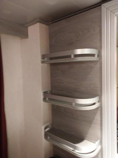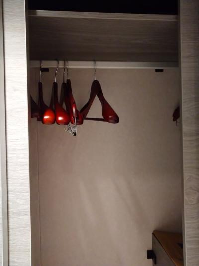 ドアの横にコートかけ3個。ソファーの横の通路は75cmくらいスーツケースを開けることができるが、そのままでは通行が困難。荷物は引き出し、ボックス棚、クローゼットを使えばほとんどスーツケースから出せる。- 旅行時期