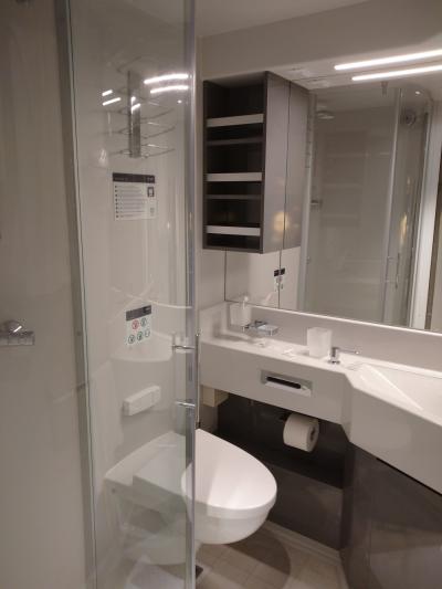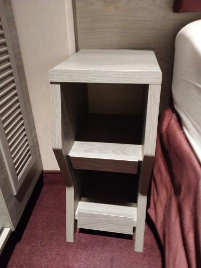 ベッドはダブルでセットされているが、1日2回(朝食、夕食時)清掃してくれる係に頼めばツインにしてくれる。ソファー、テーブル、イスがあり、バルコニーにはイス2個とテーブルがある。USB充電コンセント4個、日本製が使えるコンセント2個、SEタイプコンセント2個ある。セキュリティーボックスのある棚の寸法は縦20cm横32cm奥行42cm