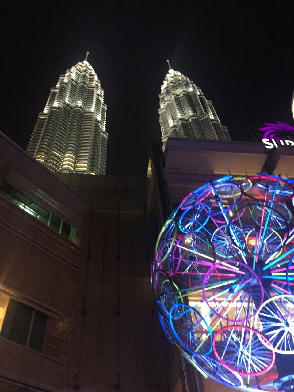 ツインタワーの場所はパビリオンモールからスカイウォークを歩いて15分位で着きます。ツインタワーの周りはとても観光客が多く夜になるとライトアップされKLCCパークからの夜景は公園の噴水のライトアップと一緒に見ると見応えがありとても綺麗です。