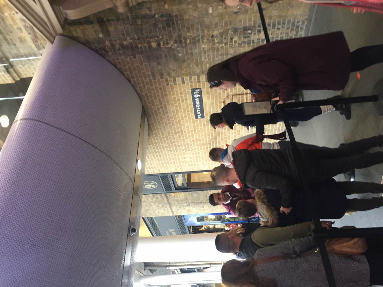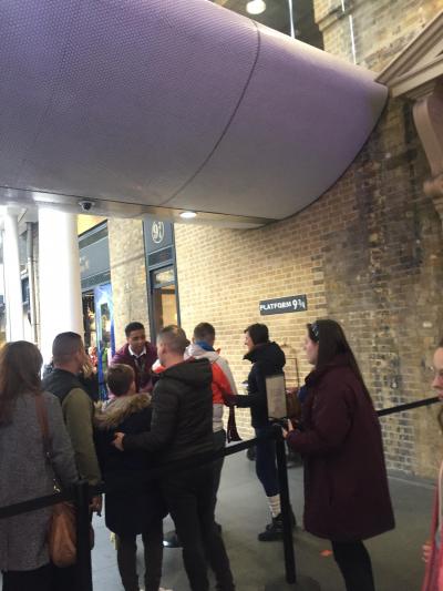 この場所はキングクロス駅の構内の1階にあります。キングクロス駅の中でもこの場所だけが列ができていて写真を撮る人が並んいます。ハリーポッターの映画を見た人ならわかりますが壁にすり抜けるように取ってが出ています。