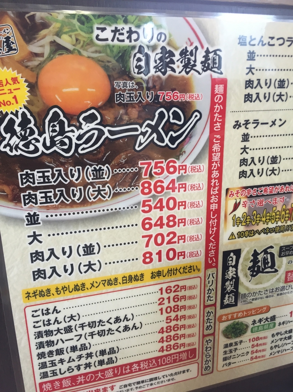 この店は藍住ICから車で5分位の所にあり駐車場も広く10台位停めれます。店内は綺麗で注文から早く料理も出てきます。この時は肉玉ラーメンを食べました。最初の一口はとても美味しいのですが最後の方はとても濃く感じ飽きてくる味でした。