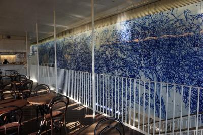 外壁も内壁も白地に青の椿の木(?)の陶板画でびっしり埋められています。