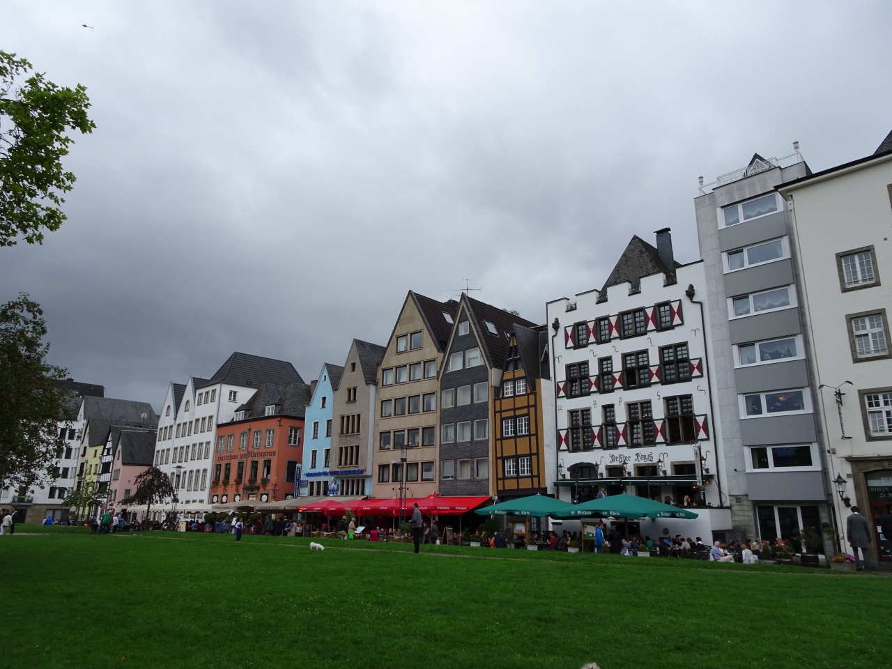 川に面した広場で、カラフルな三角お屋根のカフェや居酒屋、お店などが並び、日本にはない風景です。