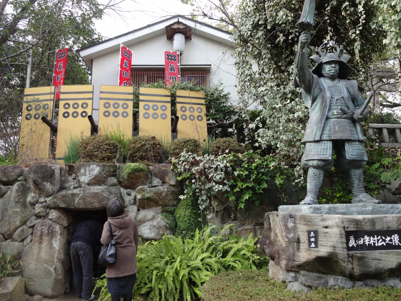 真田山 三光神社には真田信繁の銅像とともに、大坂城に続いているといわれる「真田の抜け穴」があります。