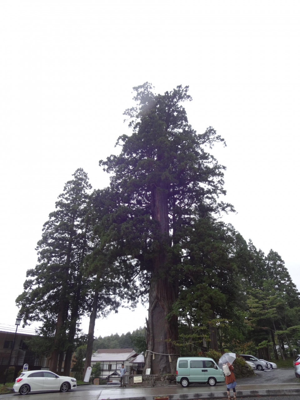 樹齢800年の三本杉は近くでは写真に入りきらず、道路を挟んで撮影しました。- 旅行時期