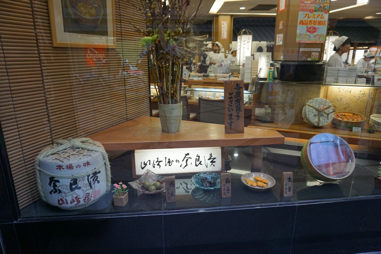 近鉄奈良駅を地上に出てすぐ右の商店街アーケードを南に進むと、アーケードのおわり右側に山崎やという奈良漬け専門店があります。