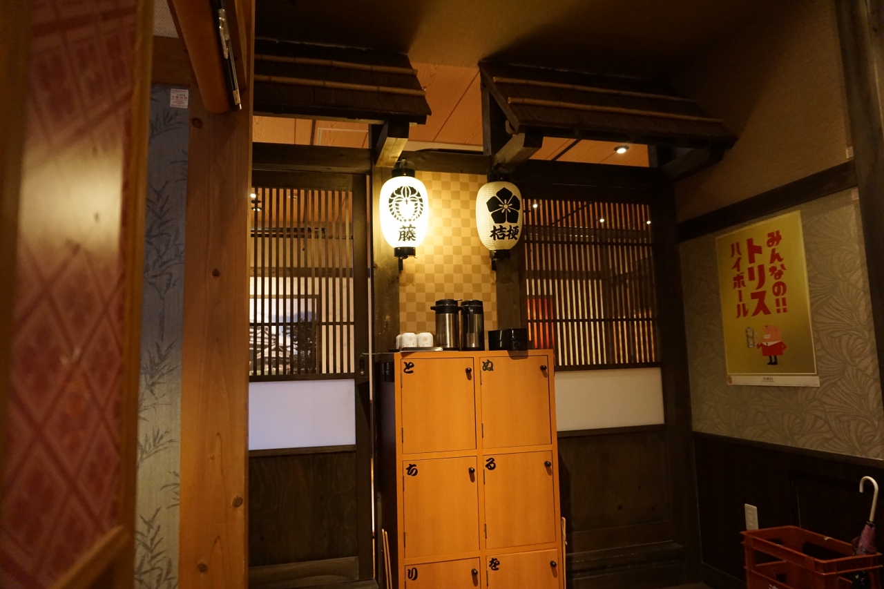和風の居酒屋で、4人テーブルがロールカーテンで仕切れるようになっています。