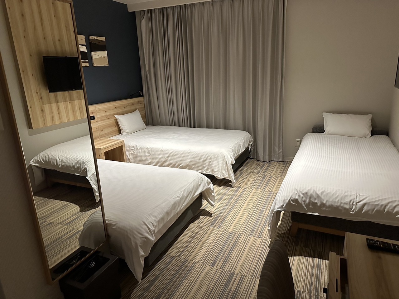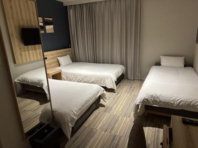 ビジネスホテルですが、かなりコスパが高いと思いました。土曜に家族4人で泊まって1万少々。部屋は流石に狭いですが2段ベットが置かれてあるので子供達は楽しんでいました。共有スペースにはドリンクや味噌汁、漫画等の無料サービスがありました。朝食付のプランでしたが朝食もかなり良かったです。