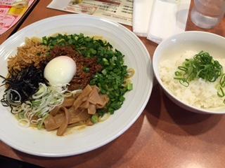 ひき肉たっぷりのソースに温玉、メンマ、ニラや鰹節などのトッピング。