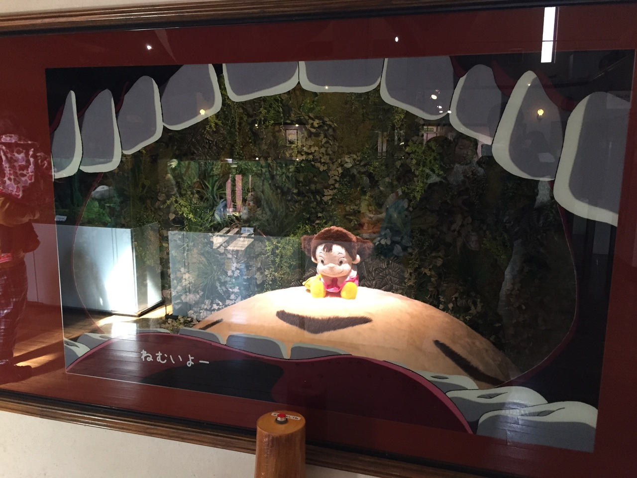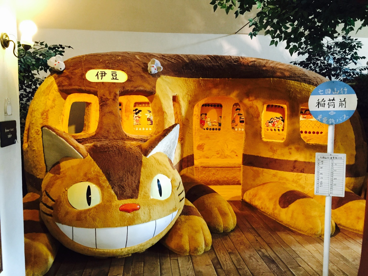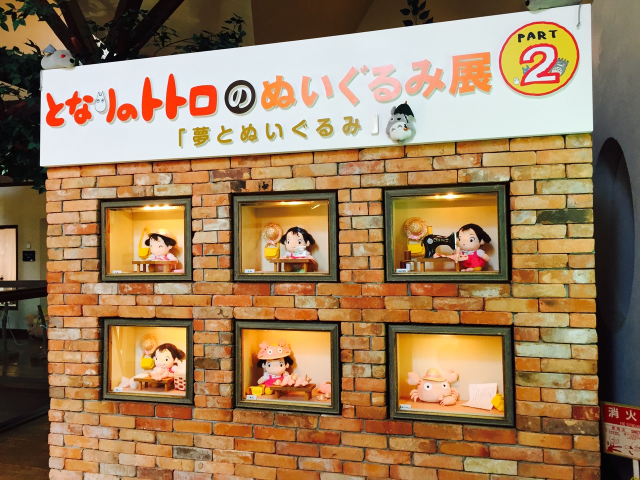 名前はテディベアミュージアムですが、お目当ては完全に期間限定のとなりのトトロ展。テディベアの方はさらっと見て二階に向かいます。天井からぶら下がっている大きなトトロがお出迎え。大迫力!娘は大興奮!猫バスでの記念撮影も嬉しい。懐かしいシーンが再現されていてなかなか楽しかったです。気がつくとほとんどのお客さんが二階へ。お土産ショップ、カフェなどもあります!