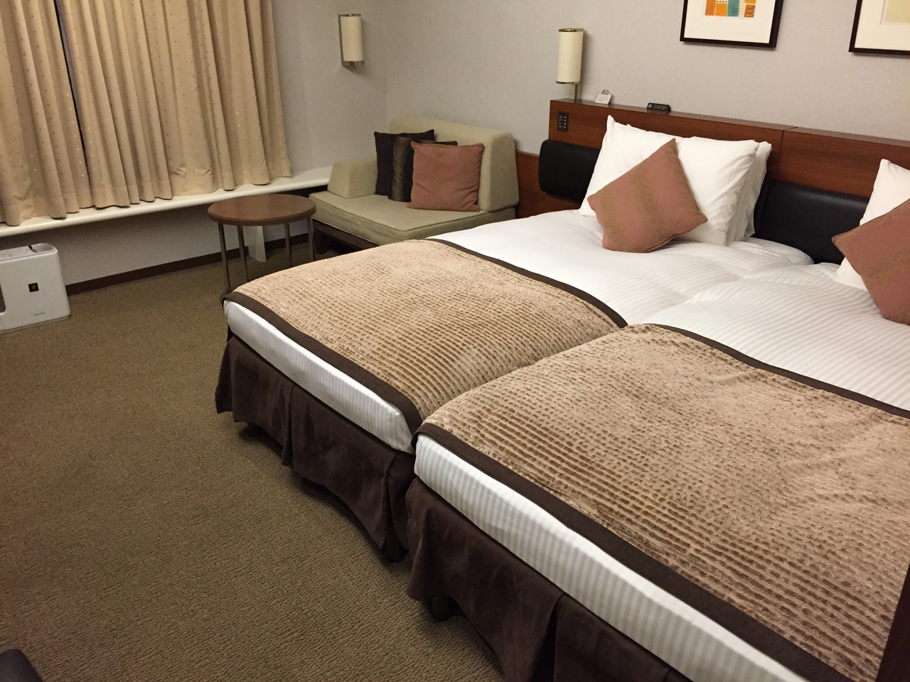 部屋はツインで、ソファーやテーブルもありました。良かったのは部屋風呂と景色。部屋風呂はかなり広くてくつろげました。2階に有料のスパがありますが利用する必要ないですね!