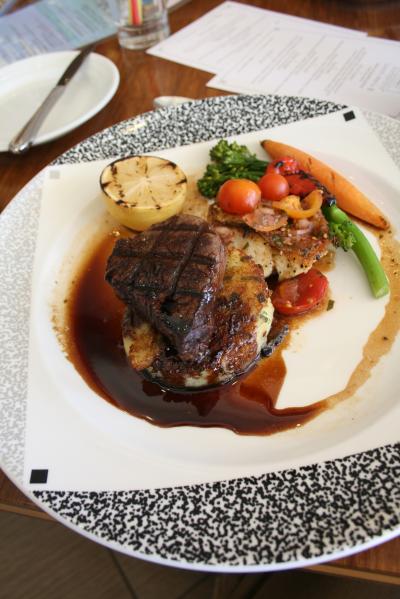 メニューは豊富でガーリックシュリンプをはじめステーキなども食べられる。