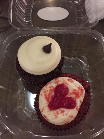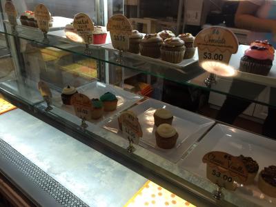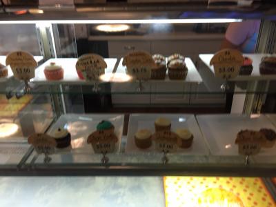 女性、子供には人気がありそうなかわいくて色鮮やかなカップケーキがずらりと並んでいます。価格は3ドルから5ドル。クッキーなんかもありました。