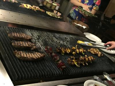 夕飯のバイキングは海鮮焼きにはじまり、刺身、ステーキなどなど大満足のボリューム!