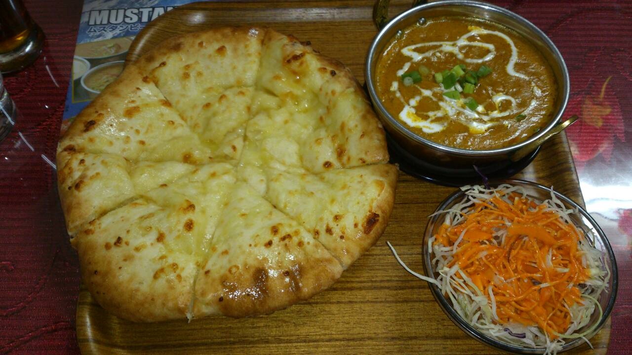 カレーセットでチキンカレーとおいしいと評判のチーズナンを注文(小さなサラダ付き)