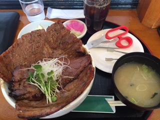 どんぶりからはみ出るほどの豚肉。見た目はすごい!