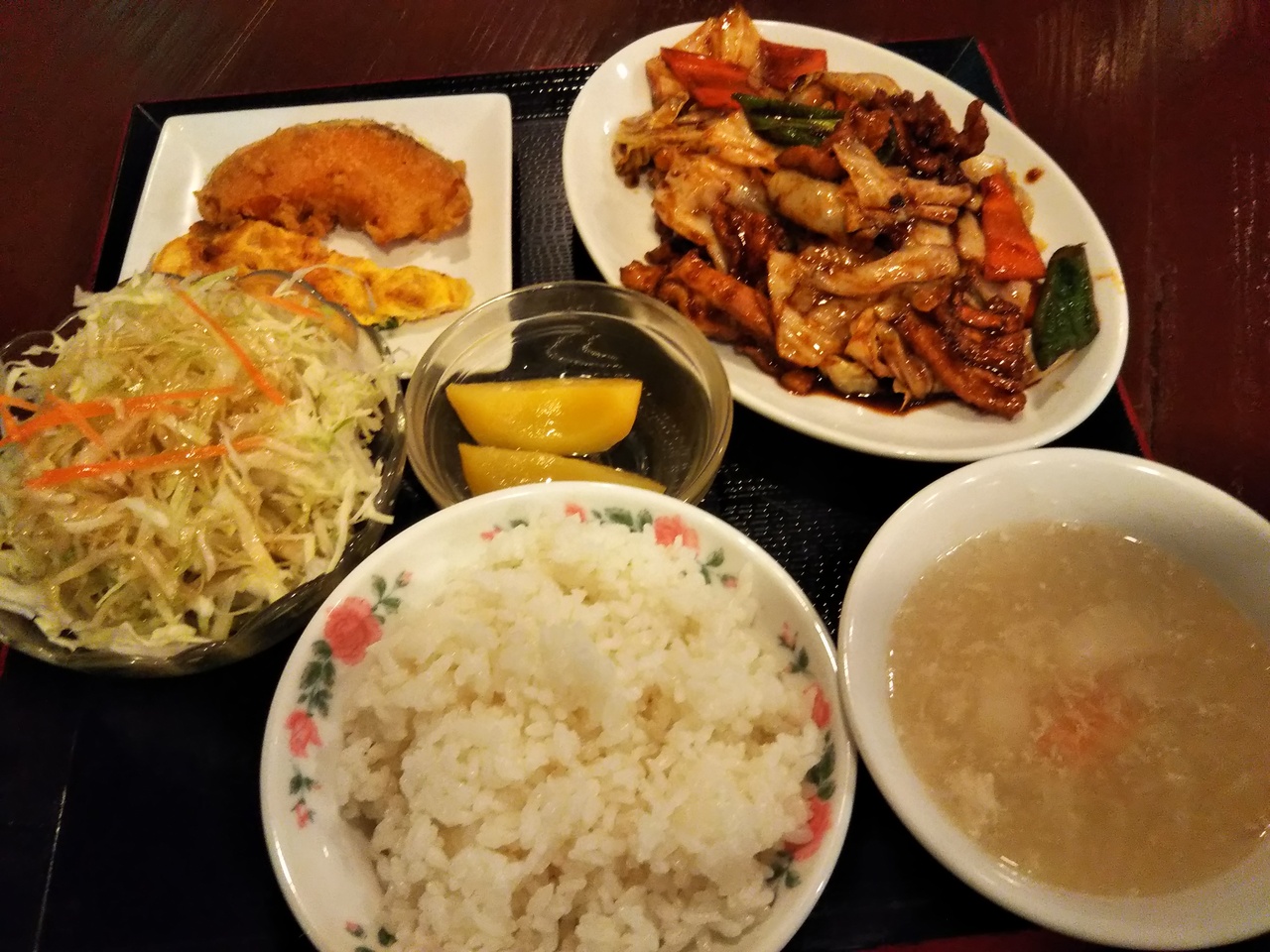 私は回鍋肉定食を頼みましたが、辛かったです。ごはんとスープはお替り自由です。