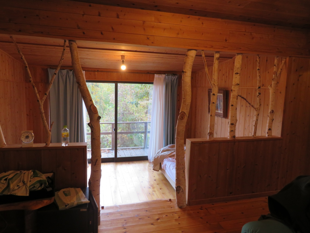 コテージは新しくて広いし、柱が白樺だったりとおしゃれで最高。部屋からの眺めはホテルの方が良いだろうが、レストランや広大な庭、お風呂からの眺めで十分。ホテルから外を歩くのは2~3分なので食事やお風呂も特に大変な感じはしなかった。