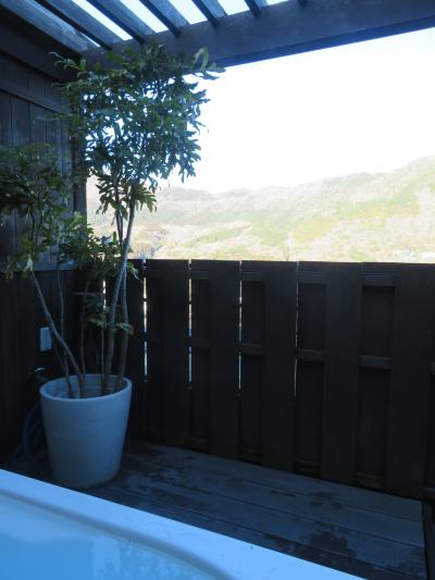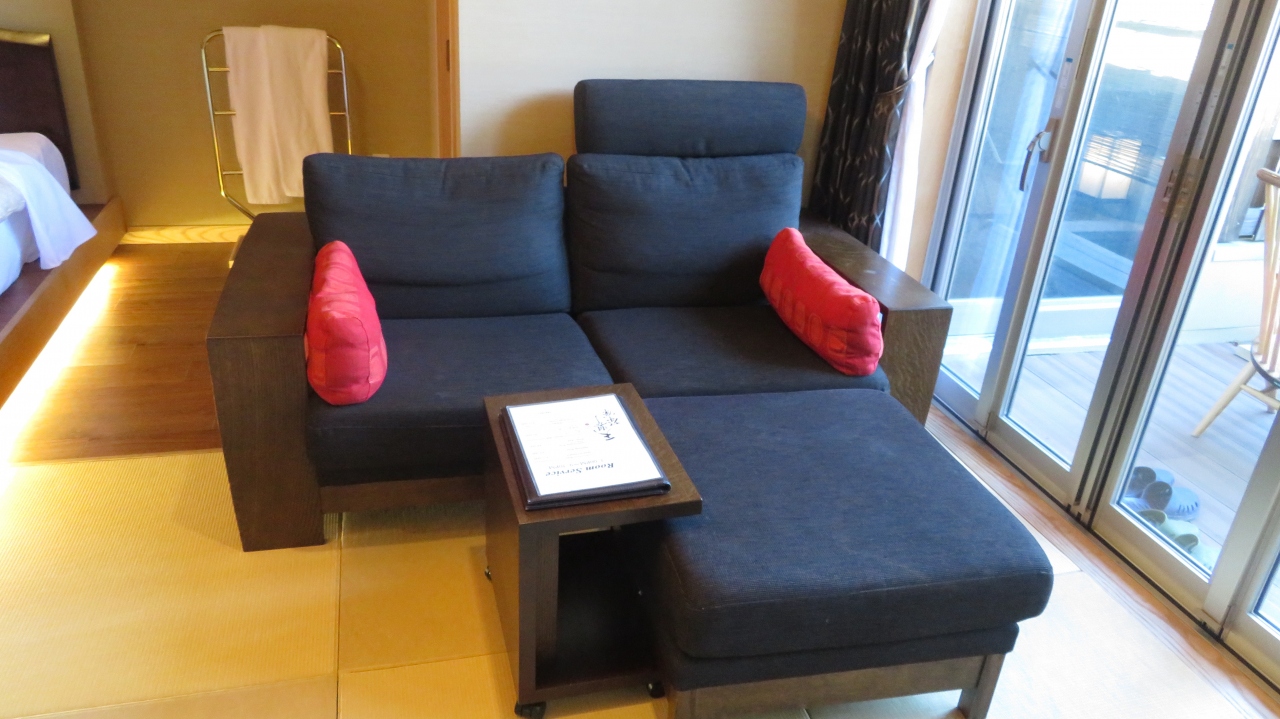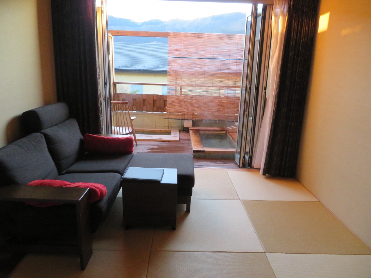 お部屋に足湯と露天の他コーヒーミル、シモンズベッド、ナノスチーマー、タオルウォーマー、飛騨製のソファなど至れり尽くせり。なかでも評価したいのは、ただでさえ広いのに壁が一面硝子戸でしかも蛇腹に開く事。開放感が半端ない。