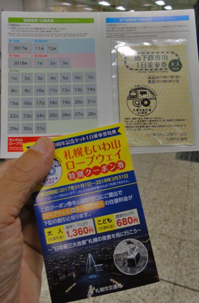 地下鉄は自動改札対応の紙製磁気の切符。地下鉄は使用日をコインで削り、下車時に運転士に見せます。別の切符になっているので、地下鉄と市電を別々の日に使うこともできます。駅の窓口で取り扱っていて、自動券売機では買えません。購入時には、藻岩山ロープウエーの割引券もついてきました。