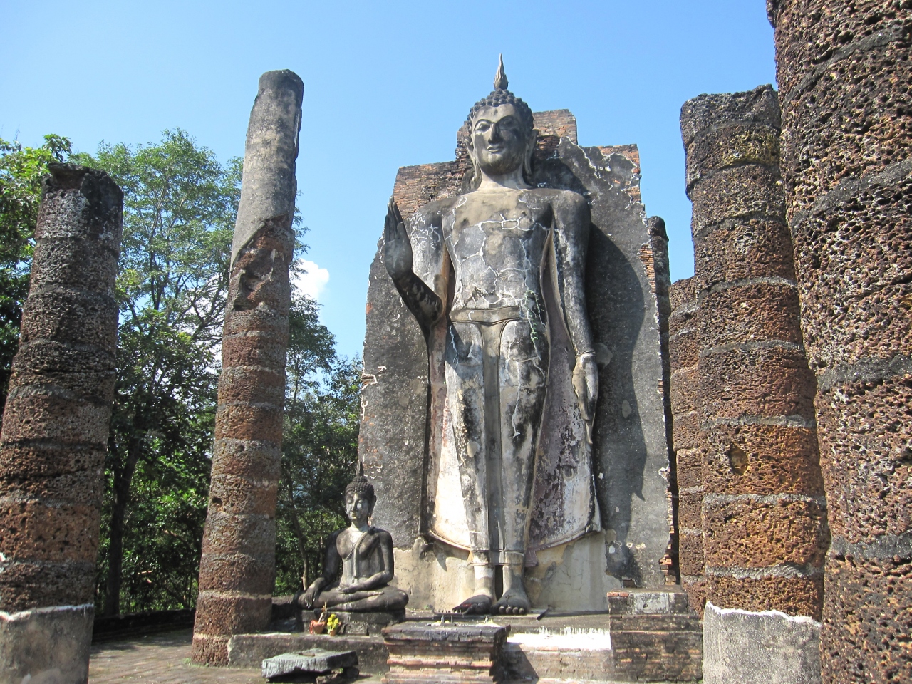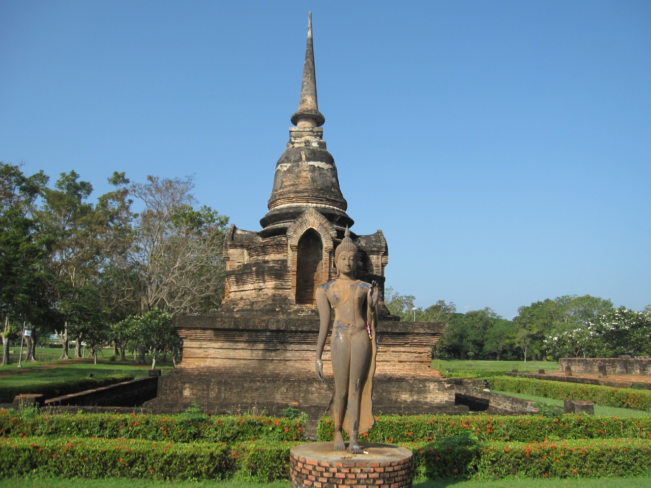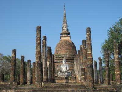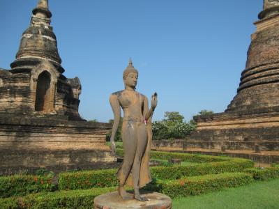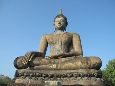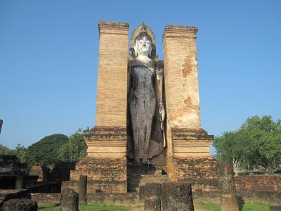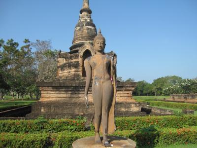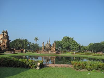 すぐそばで見てもすばらしいですが、少し離れて池越しに見てもすばらしいと思います。ここに限らず、スコータイの仏様はみな優しい顔をしており、みていると心が和みます。- 旅行時期