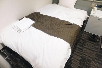 狭い部屋のほとんどをベッドがふかふかのベッドが占拠し、その右側にテーブル(もちろんイスはベッド!)、壁には薄型テレビ、ハンガーや無料のミニバーは端っこの小さなスペースに。