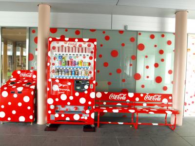 早速入口に草間さんの作品が飾られていて、ベンチや自動販売機、ゴミ箱までが赤と白の水玉模様で草間ワールド全開です。