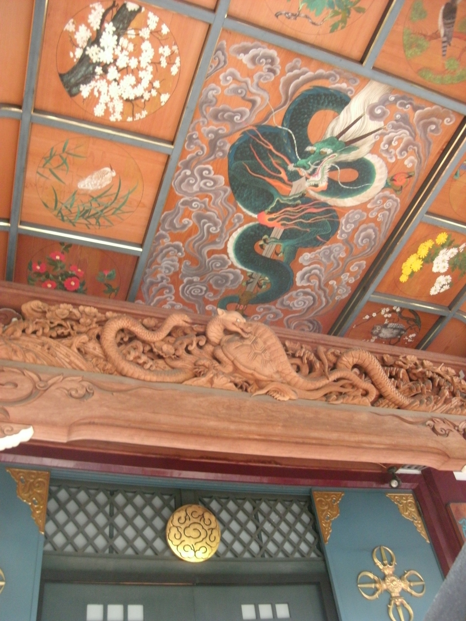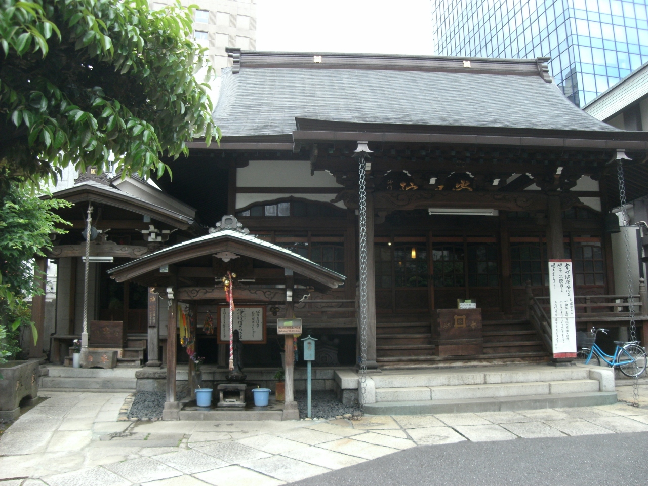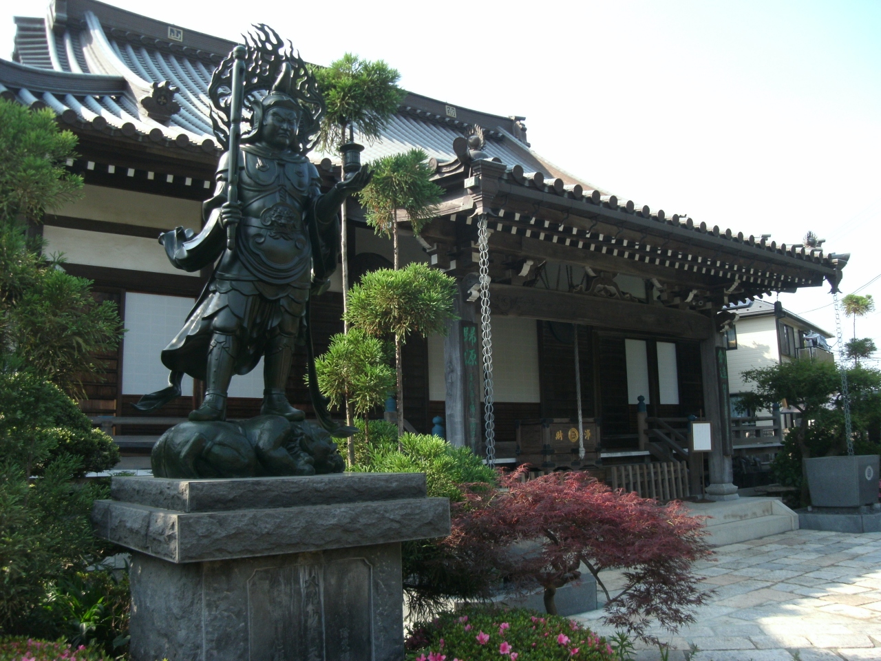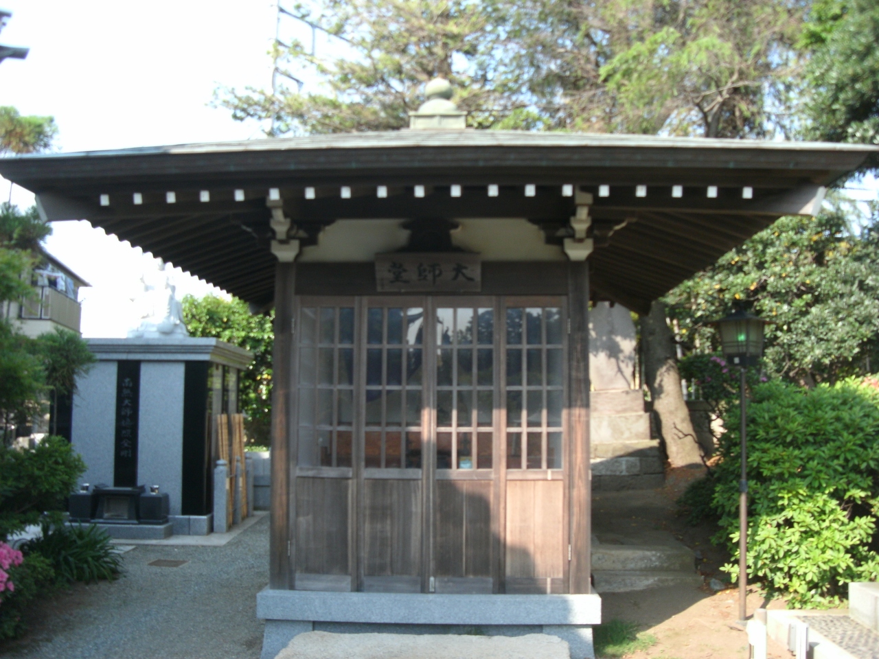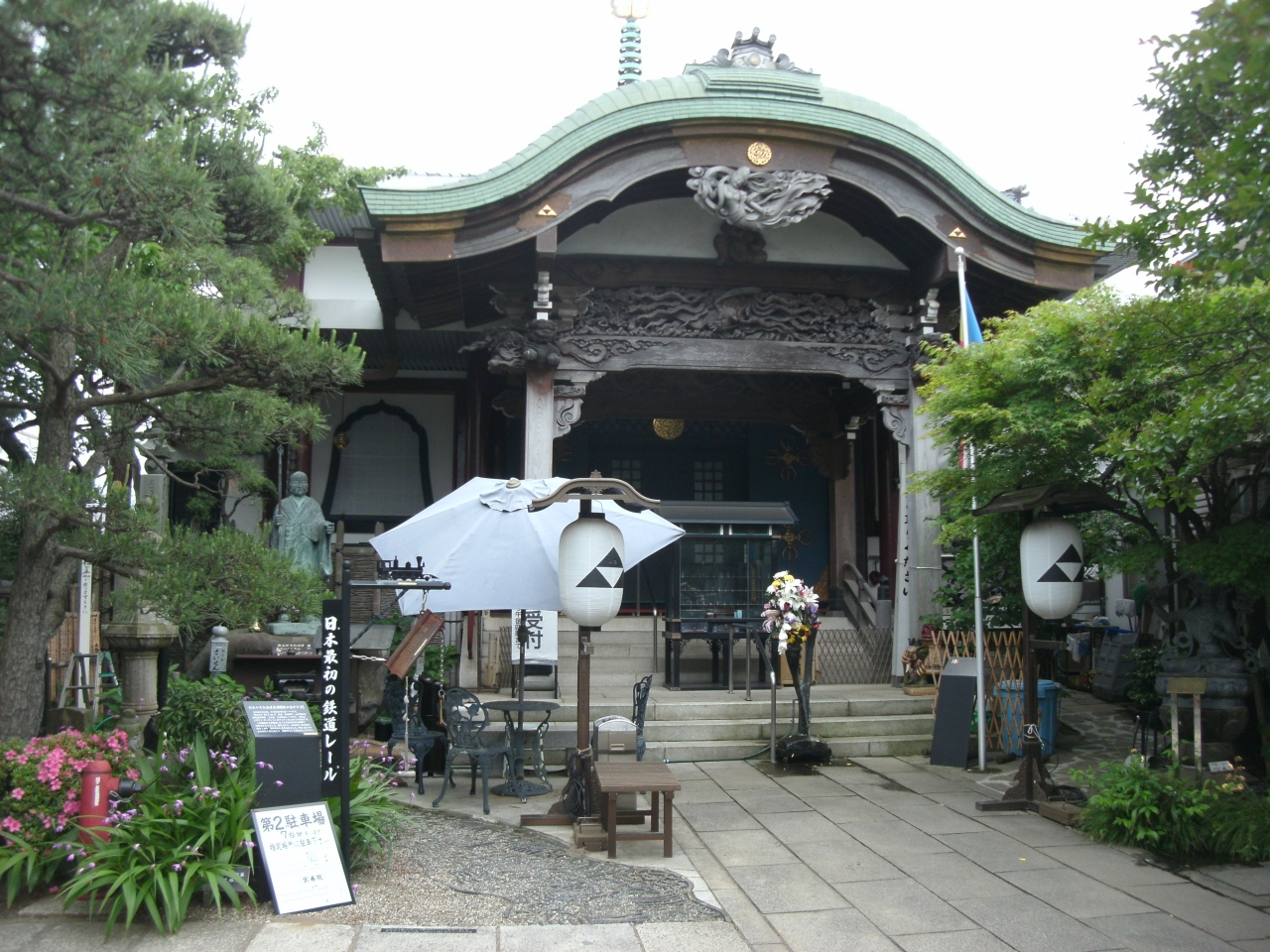 ミニスポット多く、各所毎解説がついていましたが、全てコメントできませんので主なところ。まずは本堂・向排の彫刻と天井の絵、解せる方にはすぱらしいものでしょう。庫裡の前、足元の小池にメダカがスイスイ。本堂前に武蔵ゆかりの瓦、日本最初の鉄道レール(叩ける)など、境内狭いながら大師像はじめお地蔵さん石仏類安置。お寺のご好意?テント張りの喫煙コーナー。境内の片隅には神社も・須賀神社とありました。