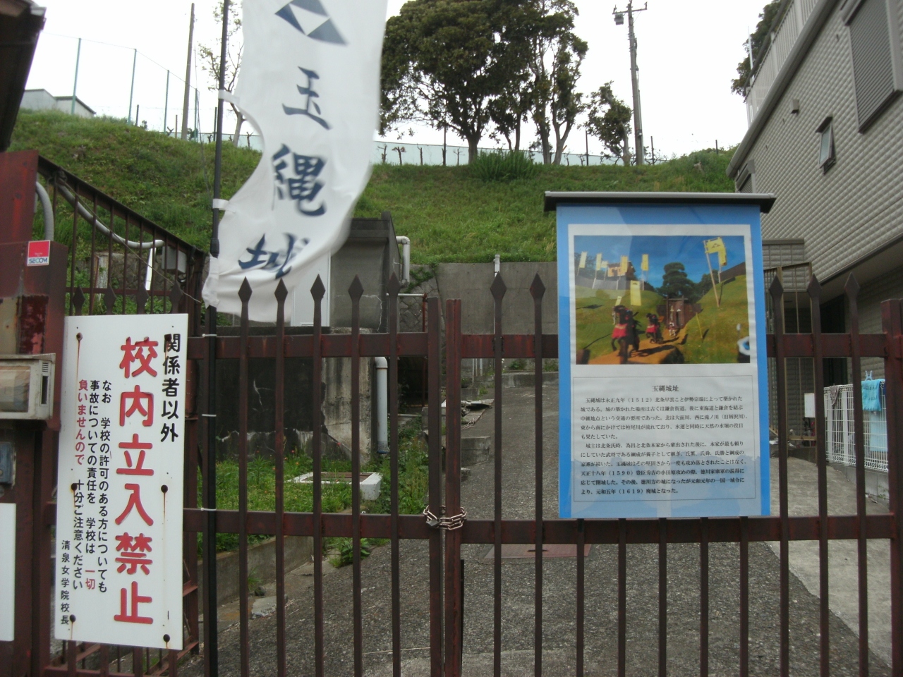 玉縄城跡の主要地域は現在清泉女学院ですので遺構等の現地見学には学校問合せ(土日祝日・行事日等見学不可、許可要)が必要です。正門前でうろちょろしていますと不審者払いされる恐れあります。