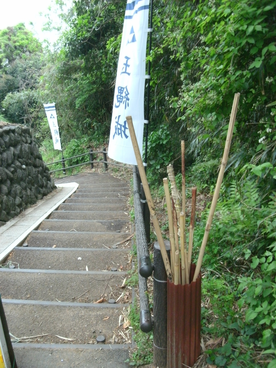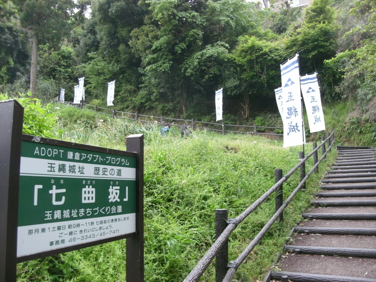 なお、七曲坂周辺には玉縄城のノボリが立てられて、道も歩き易く整備され入口には竹杖も用意されていました。※歩き易いと言っても、坂道です。足場は気をつけて。
