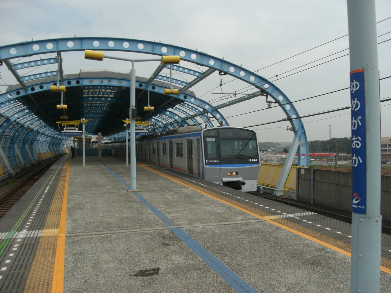 相鉄いずみ野線湘南台駅から一つ目です。駅名が新しい感覚で初めての人は何か期待を寄せる駅ですが、駅前周辺はコンビニ・お店が見当たりません。駐輪場・パーキングはありますが、ロータリーなどありません。でも、ホームは橋上でアーチ屋根がしゃれています。また、ホーム上からは彼方に湘南台のビル群を、近くに地下鉄下飯田駅、周辺ののどかな田園風景が望めます。ここ横浜市ですが・・。
