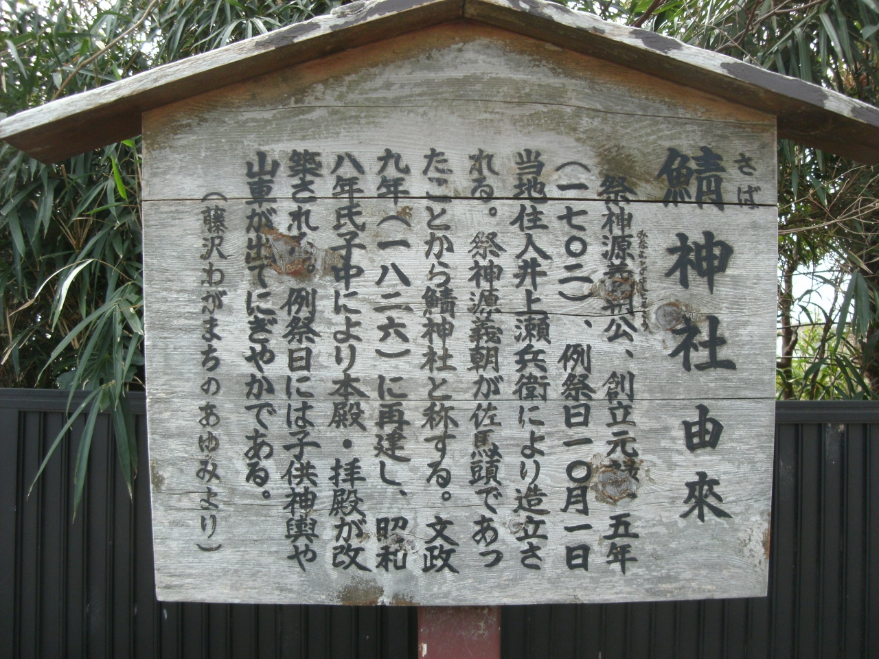湘南台・境川側にある神社です。祭神源義朝が左馬頭であったことから左馬→鯖(神社)とのこと。何故鯖の字かは知りませんが、ご当地のサバ神社のひとつです(左馬・佐波・左婆等の神社)。