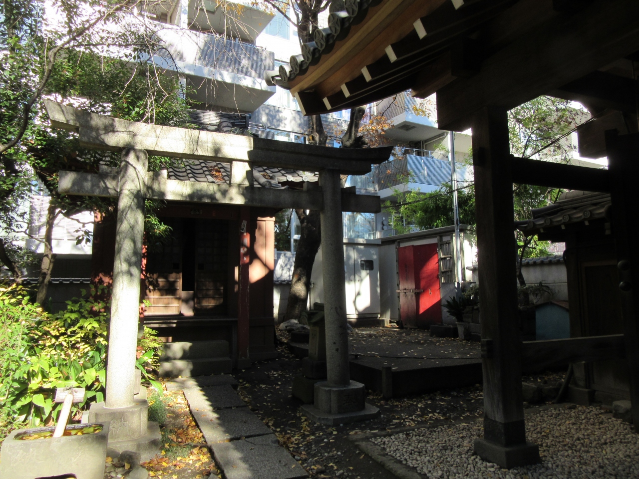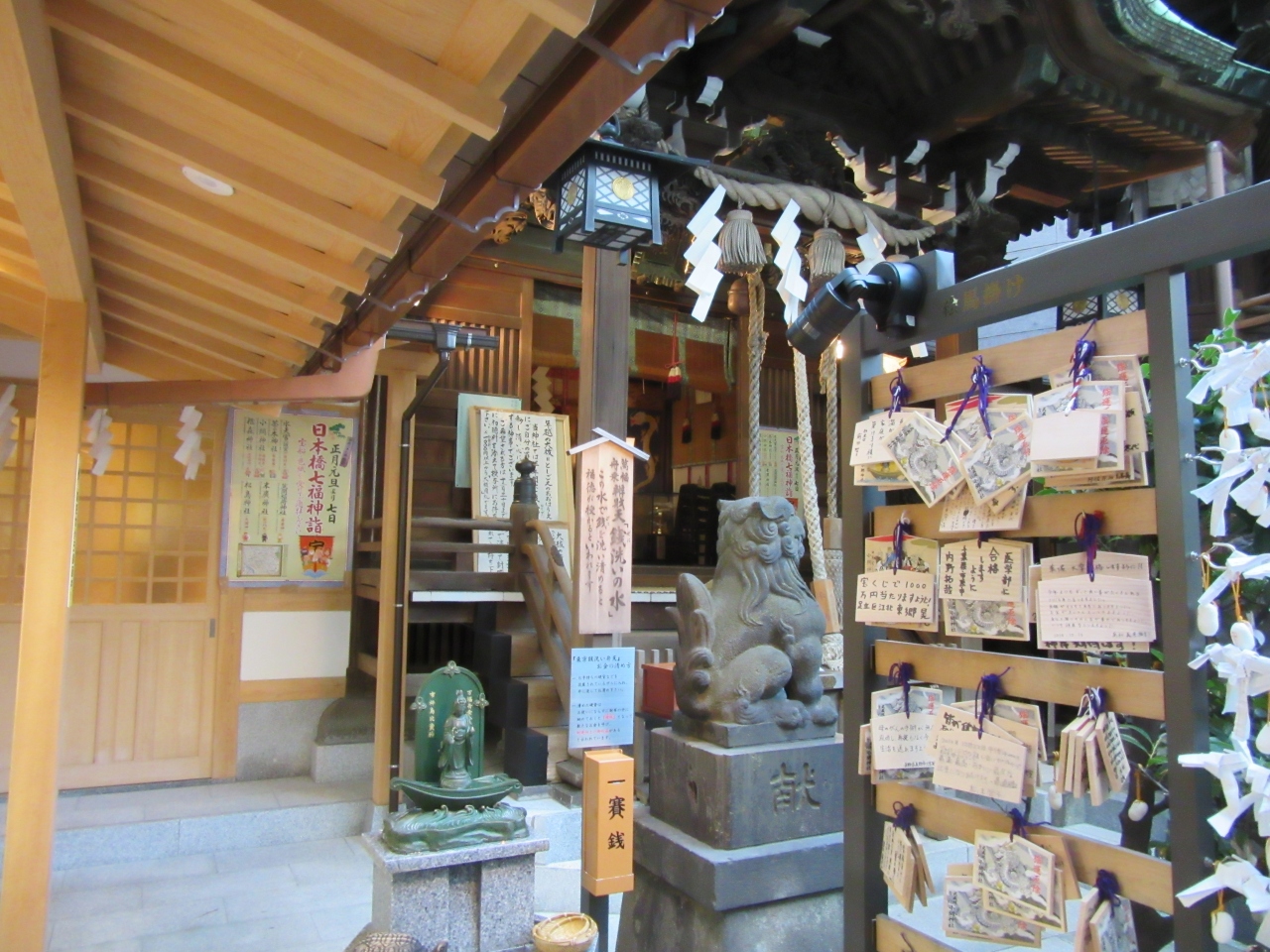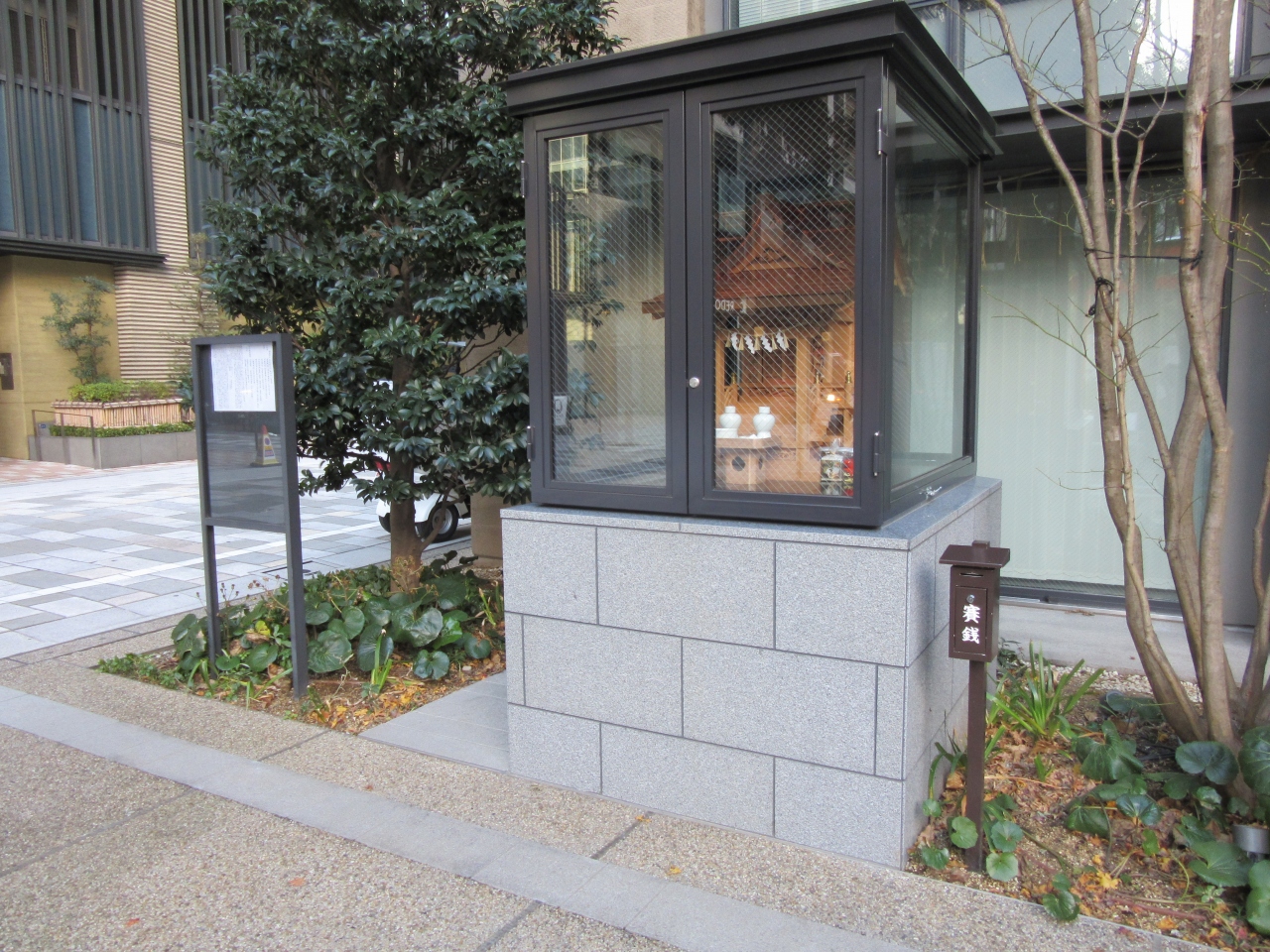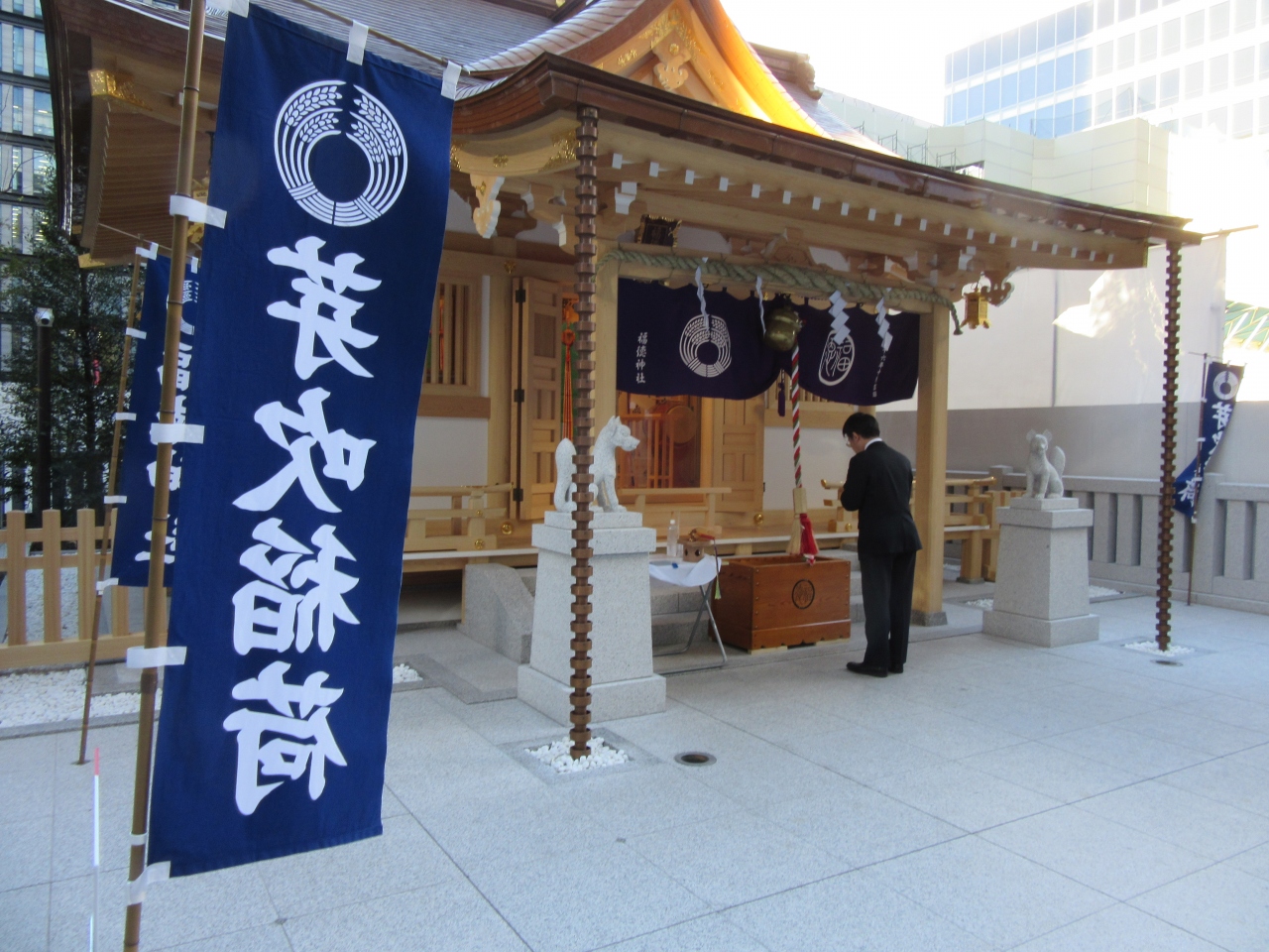 ところは東京メトロ:三越前駅、コレド室町とYUITOの間辺りでしょうか(クチコミ地図情報ではポイント離れています)。新しく整備された境内にピッカピカの真新しい社殿が鎮座しています。手前の空地(福徳の森)に小さい祠があります。これが元の神社のようです(グーグル他の地図で表示される)。