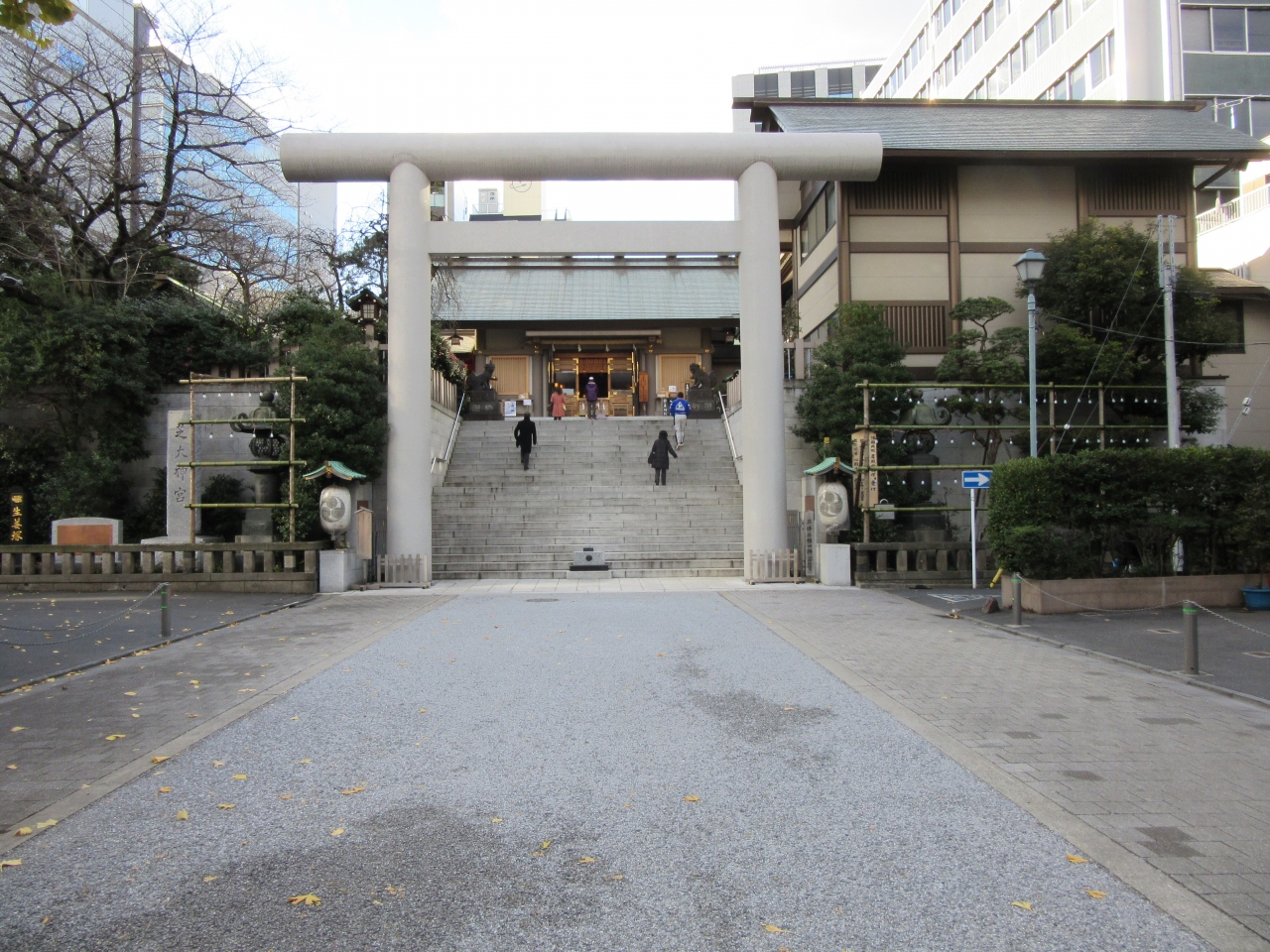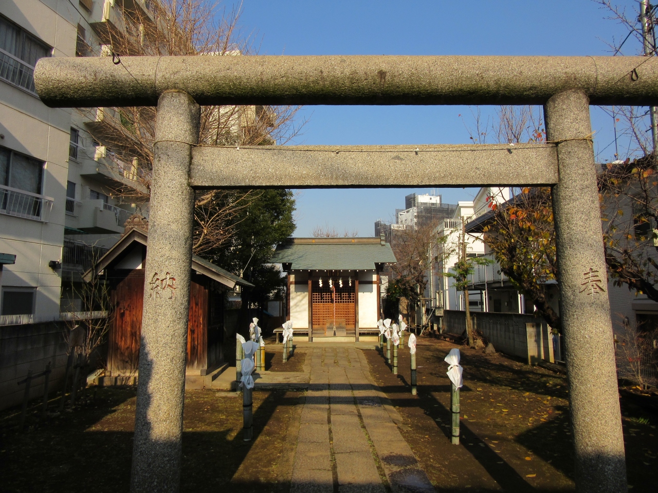 芝大門1丁目・15号線沿いに参道入り口があります。都会のまっただ中の神社風情がそこにあります。鳥居石段上るとすぐに本殿、右は社務所。左に手水舎。力石の掲示がりますが前のベンチで参拝者が休憩していると見にくい状態です。