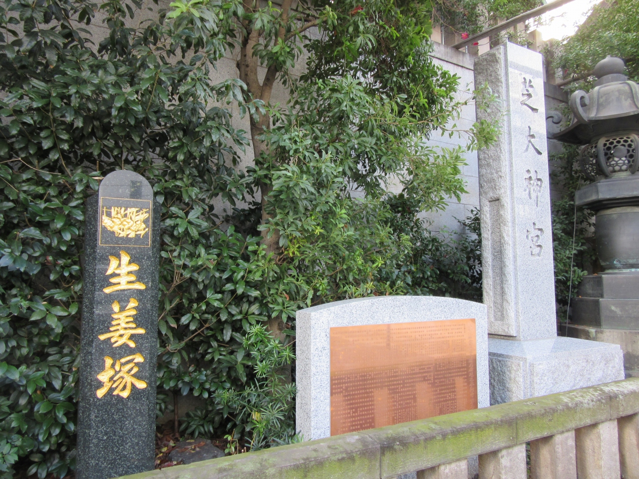 石段下両脇に塚碑がふたつ。向かって左が生姜塚、右が貯金塚。ここの歴史を伝えています。