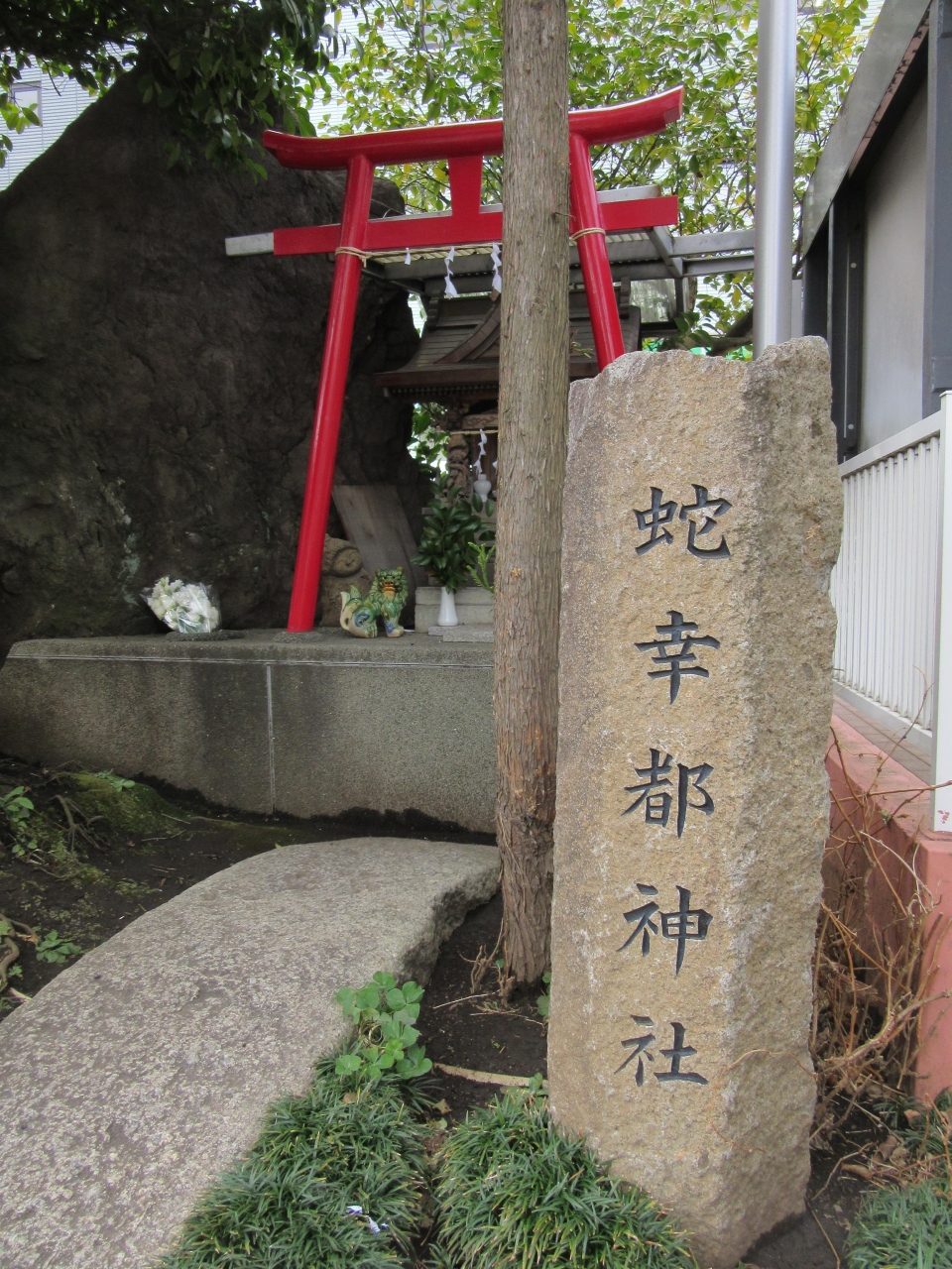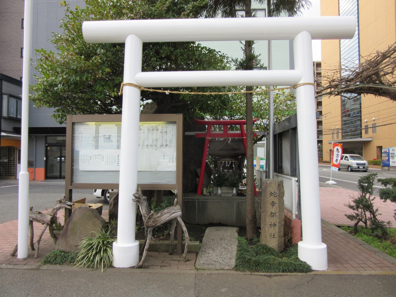 新横浜1丁目4のファミリーマート脇の空間に白い鳥居と鹿のようなオブジェ?に祠。社号標は「蛇幸都神社」の文字。祠の前に蛇やかわいい置物が供えられています。