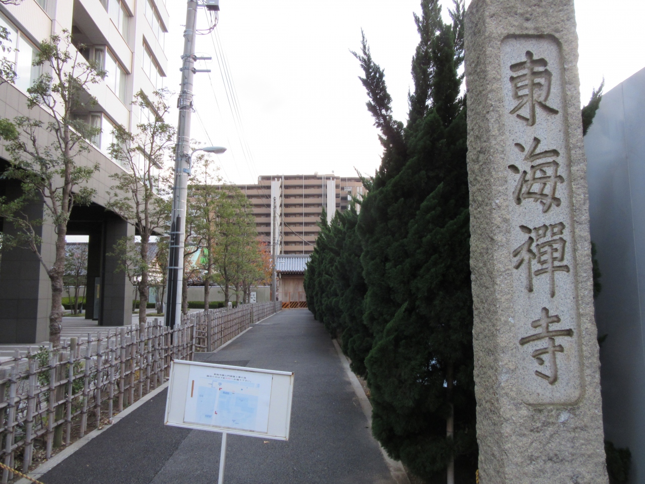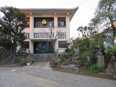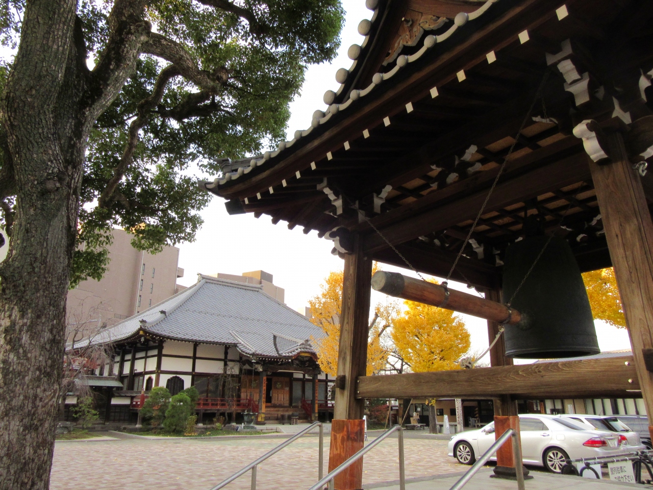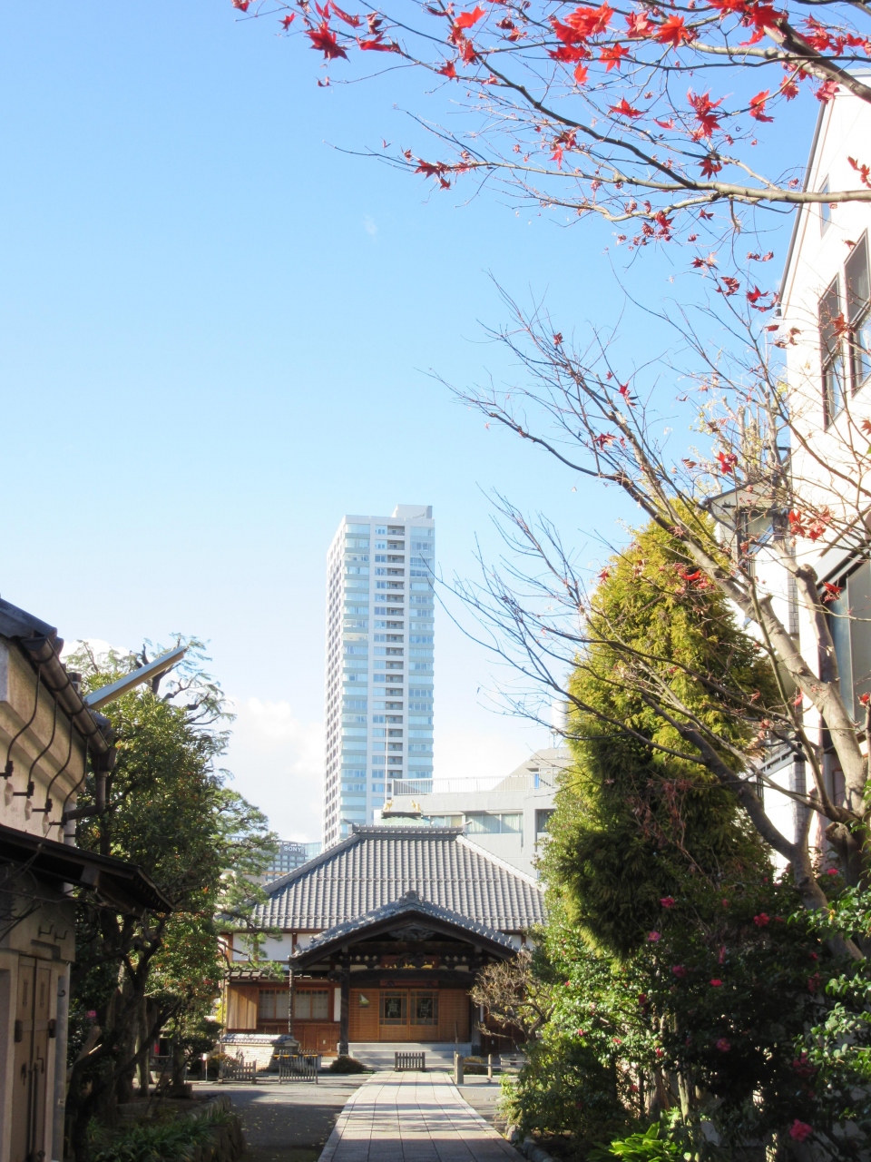 南品川2丁目、かなり広い境内・堂々とした本堂、客殿、鐘楼・記念石、墓地が広がる寺院。東京都会らしく背景は高層ビルが・・。