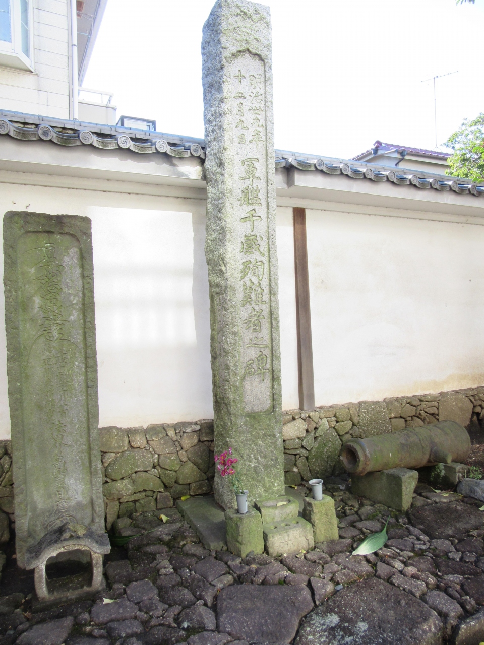 また、ここは品川百景に指定されているだけあって、境内は季節の花木が整っています。お地蔵さん・石仏も多い(名のある釈迦生誕像他墓地にいろいろ)。史跡遺構でしょうか、軍艦千歳の殉難者の碑・腐食してる大砲が境内参道にありました。筆塚の碑も。