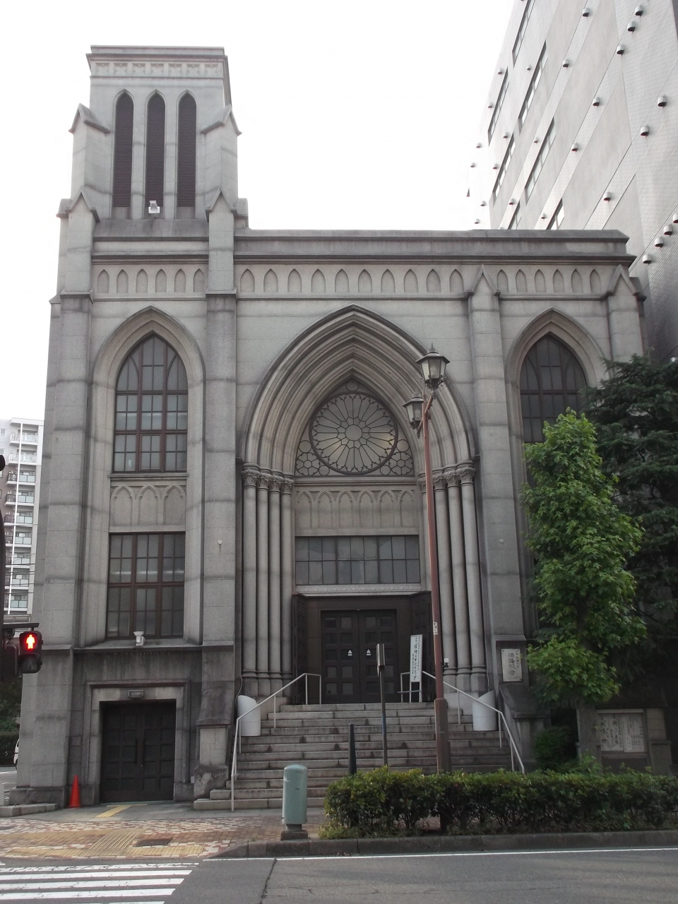 関内・桜木町間の国道16号線沿い、関内駅から4~5分のところにゴシック風の教会が現れます。根岸線車窓から見える教会、それです。