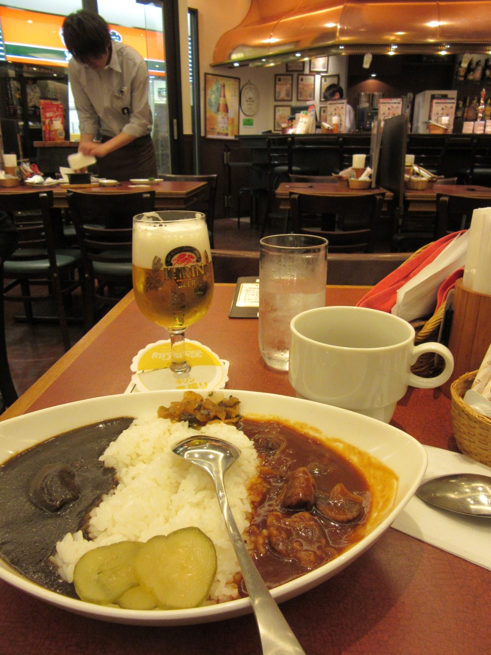 キリンシティのランチを食しました。赤ワインのハヤシライスと黒ビールカレーのハーフ&ハーフ。二つの味が楽しめるのでお得。これにランチビール、よく合います。- 旅行時期