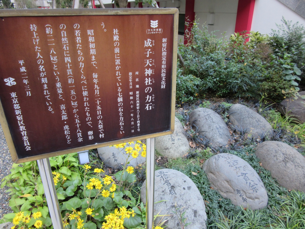 パワースポット:富士塚(登山はできません・区指定湯系民俗文化財)。力石(本殿前・区指定有形文化財)。夫婦公孫樹(区みどりの文化財)。