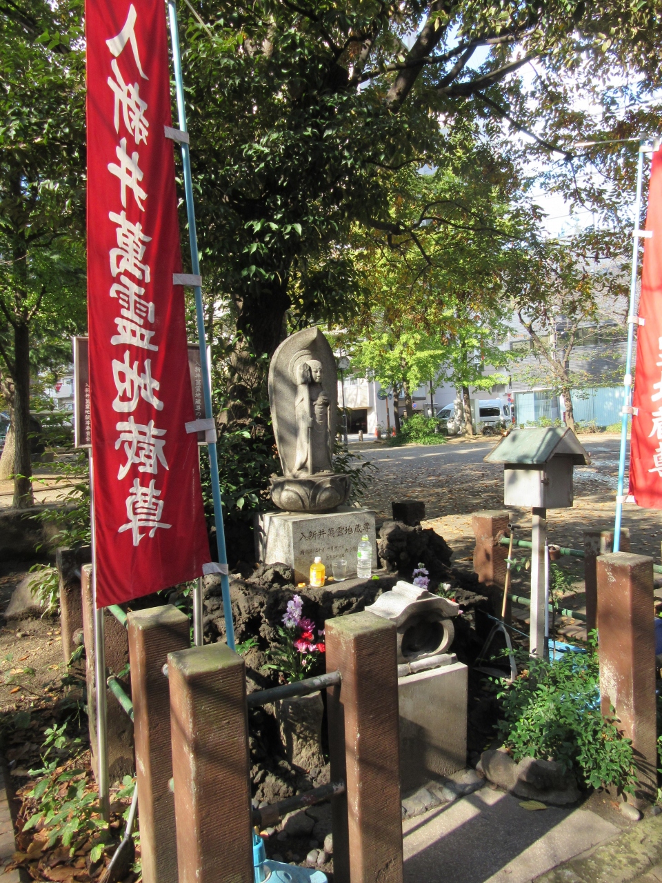 地元民に親しまれている子育地蔵、新宿区文化財の小泉源兵衛地蔵と歴史を刻む庚申塔・石塔、彰忠碑石です。
