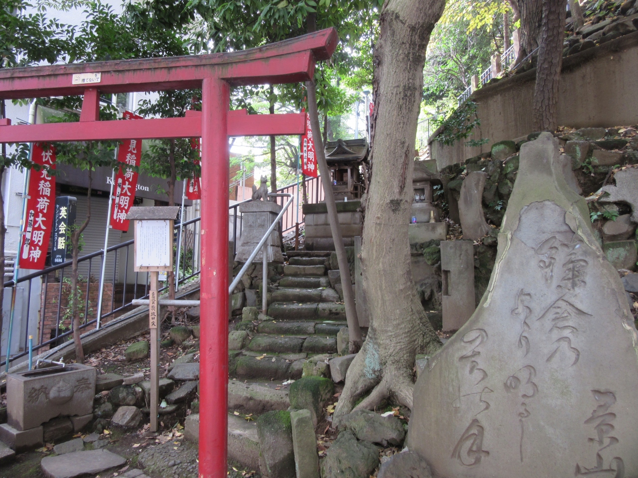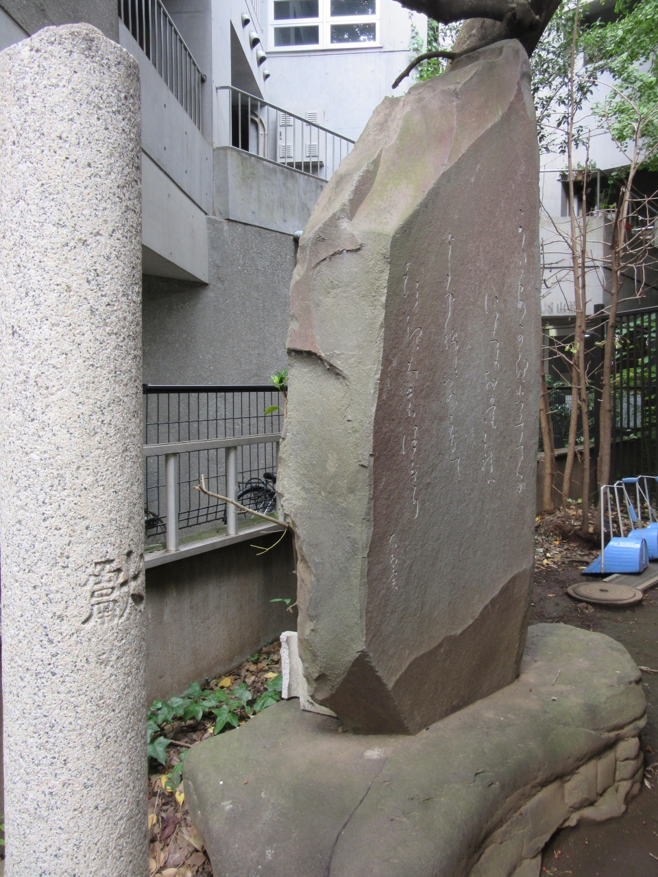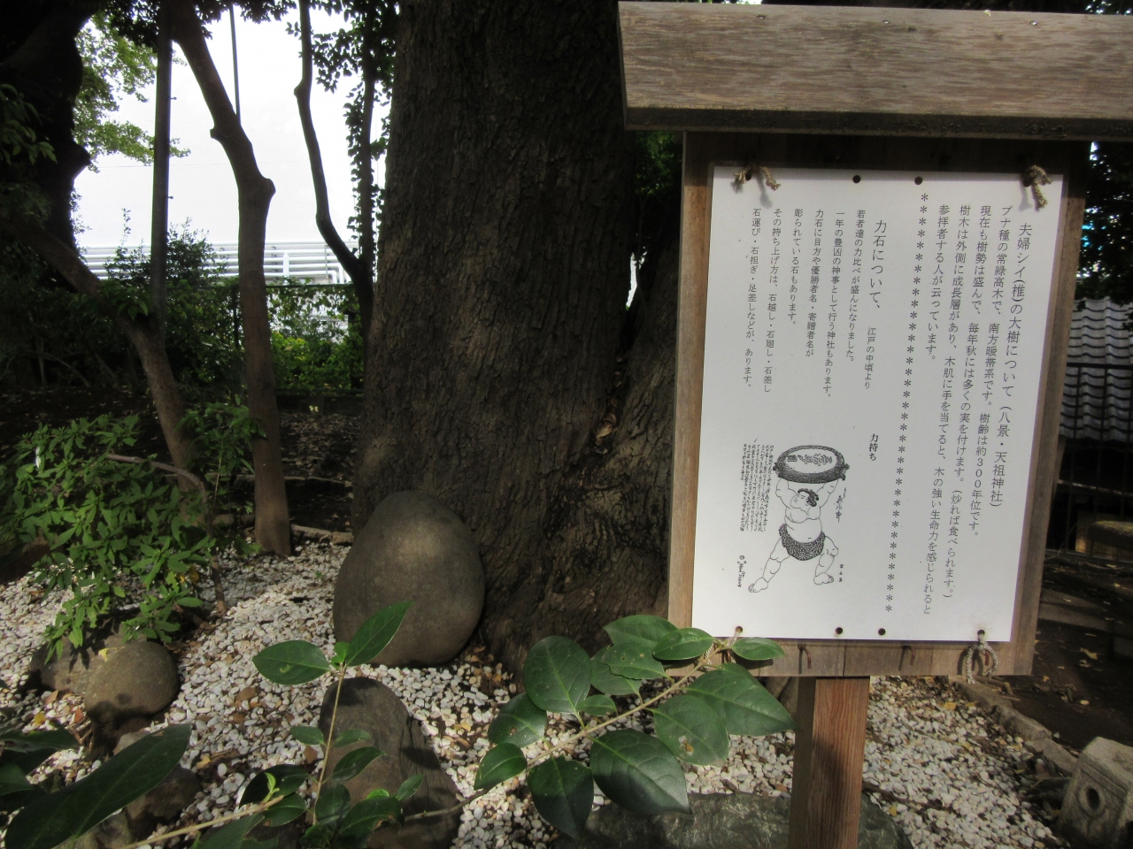 駅前道路渡り坂の入り口に「馬込文士村散歩道」の看板あるが、すぐ右手は狭い石階段、樹々に覆われ小高い。右に神社石標、左手には八景の句碑と稲荷社。急階段上が境内、神木でしょうか、夫婦シイの大樹・力石があります(案内板あり)。