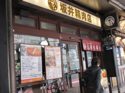 店看板は坂井精肉店。お肉屋さん? 店内はカウンター客席、テイクアウトしているとんかつのお店。