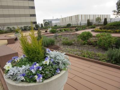 JR恵比寿駅直結「アトレ恵比寿」の屋上、エレベーターで行けます。屋上全体が公園風、緑と花の花壇、ウッドの木道(ウッドデッキ?)、ベンチが点在。