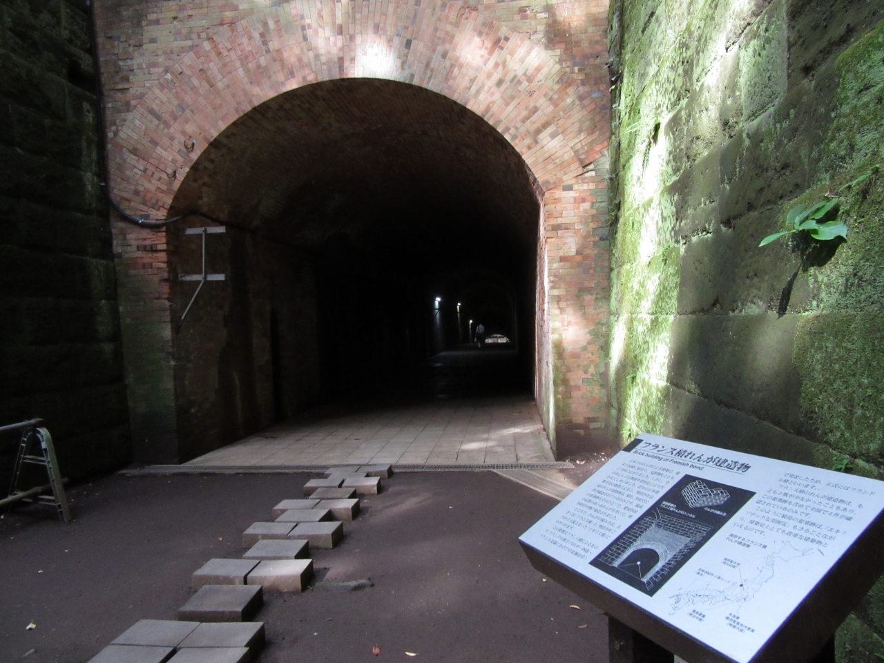 猿島島内の散策路、切通しがかっての軍の要塞施設(兵舎・弾薬庫など)跡地として歩道整備されています。そこにはいくつかのレンガ造りのトンネルがあります。途中、フランス積れんが建造物という解説版があります。ガイドバンフレットには「愛のトンネル:カップルが二人で通り抜けると・・・」と紹介されています。どういうわけでしょうか・・トンネルの中で云々ですか?良くなる(結ばれる)とのことでしょうね。
