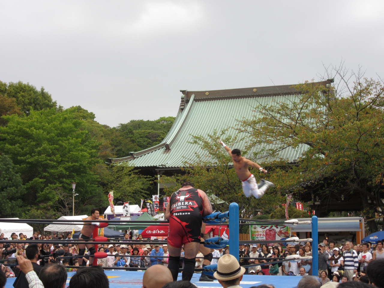 遊行寺(時宗総本山清浄光寺)会場では、昨年好評だったご当地レスラー(諏訪魔)による屋外プロレスが今年も開催(屋外リング・無料)。なんと第64代横綱曙が参戦、その巨体を披露しました。これには子供達が大喜びでした。