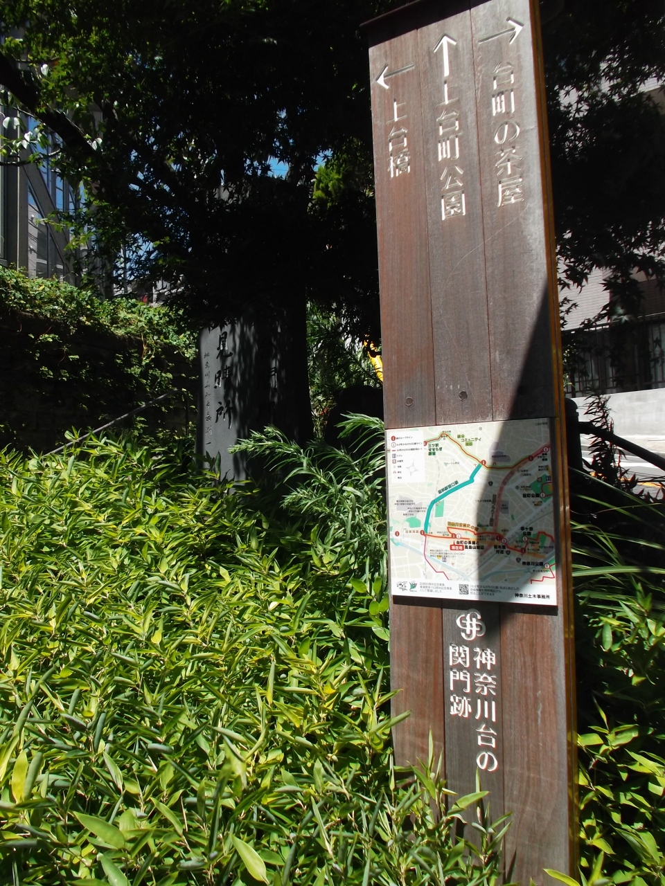 神奈川区台町の高台、坂の上辺りの三叉路の一角に木立があり真夏の今は草ぼうぼうの中、「神奈川台関門跡」「袖ヶ浦見晴所」の石碑、そしてそばに歌碑もうずくまっています。神奈川宿歴史の道の標識と解説プレートがあります。