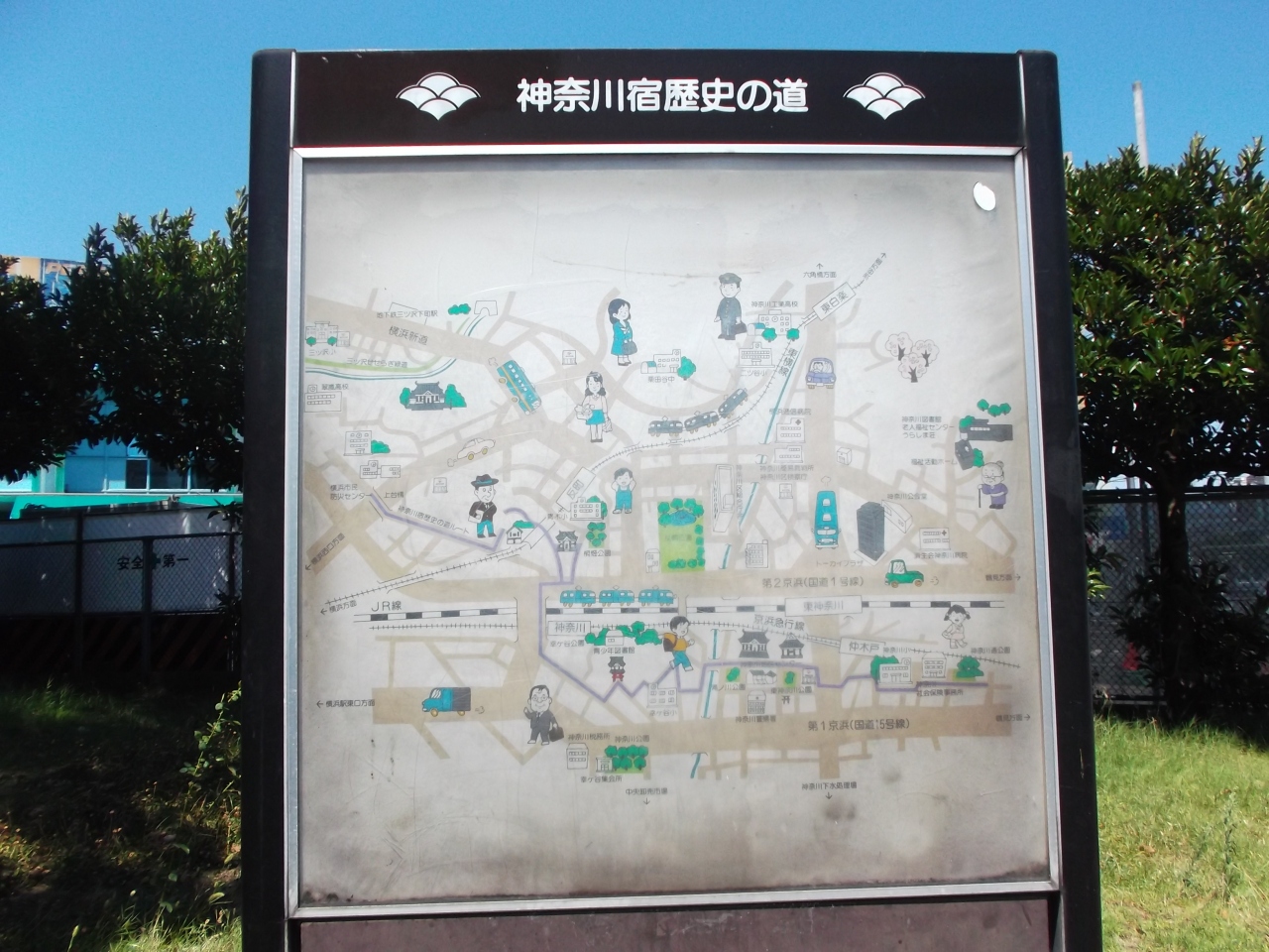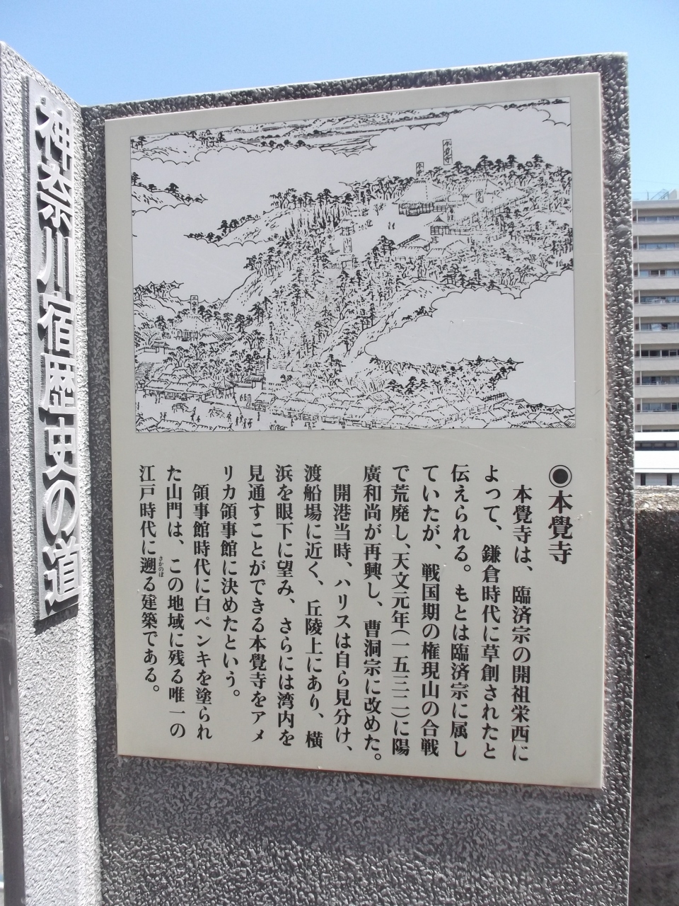 神奈川区では観光スポット・史跡案内として「神奈川宿歴史の道」の標識と解説プレートを各所に設けています。ここは幕末・開港当時は外国の領事館が寺院に置かれ、著名な異人さん(ヘボン博士等)の逗留跡エビソードが残されています。